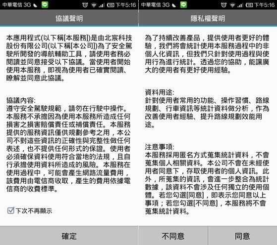 接著系統會要求你做一些協議聲明,按下確定即可,在隱私權的部分,Boring 則是勾選不同意讓該服務蒐集我的相關資料,接著就可以進入導航畫面啦。
